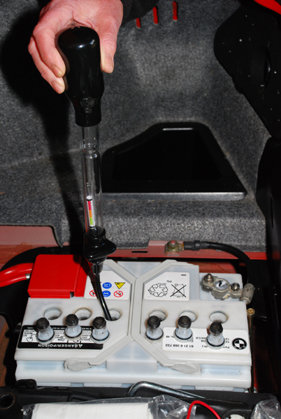 Also take hydrometer readings of each cell. With a fully-charged battery these should read between 1275 and 1300 (the specific gravity, or density, when compared to distilled water at 1000). If your battery is under the bonnet, the readings will be lower when hot, but a single lower reading indicates a dying cell. Suitable hydrometers are readily available from Halfords etc. and are also handy for topping up the cells.