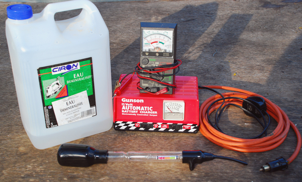 If your battery is not a sealed zero-maintenance type, it needs a check on the cell levels at least twice a year, and topping up with de-mineralised water – as is used in steam irons etc. This compensates for loss of the water in the dilute sulphuric acid electrolyte being turned into bubbles of oxygen and hydrogen by the charging current, a process known as ‘gassing.’