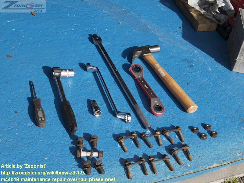 Trolley Jack, 16mm Spanner, 19mm Spanner, 19mm Socket Ratchet, E14 Socket, Breaker Bar, Hammer, Punch, Marker Pen, Lubrication (GT85)
