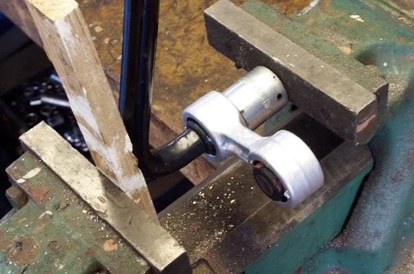 Assemble the drop link and the ARB in your vice – an assistant is very useful – supporting the outer side of the link on a piece of steel tube, or a suitable socket. If, like me, you paint your suspension, protect the ARB by inserting a piece of wood under the vice jaw.