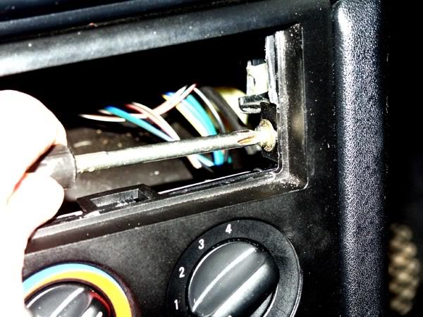 After removing the radio sleeve you will see the securing screws and the plastic ‘staple’ catches