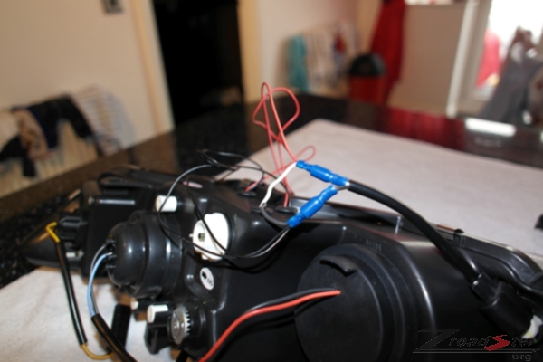 To do this you need to wire the red and black wiring from the halo rings into the black and white wiring of the sidelight. Note the instructions with the lights do not tell you which way round to wire these up, the correct method is to wire the red wire of the halo to the black wire of the side light, and the black wire of the Halo to the white wire of the side light, I chose to use bullet connectors for this. You will notice in the photo that I got the wiring wrong first time round but changed to the correct wiring as above in the final iteration.