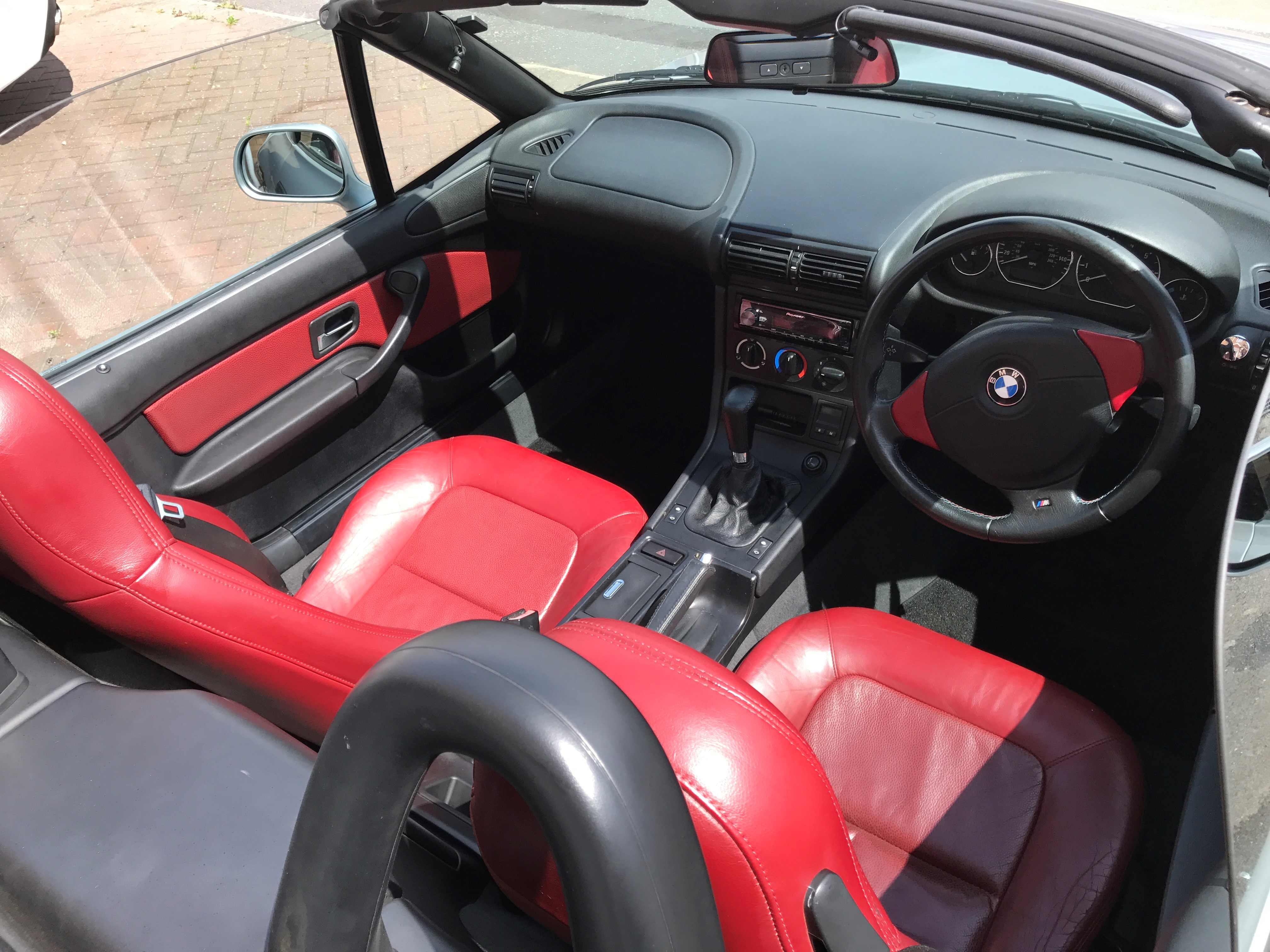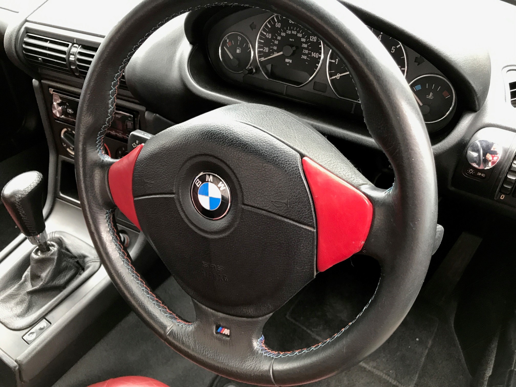 Installed an E36 M3 tri-colour steering wheel. I customised the side tabs in red leather.