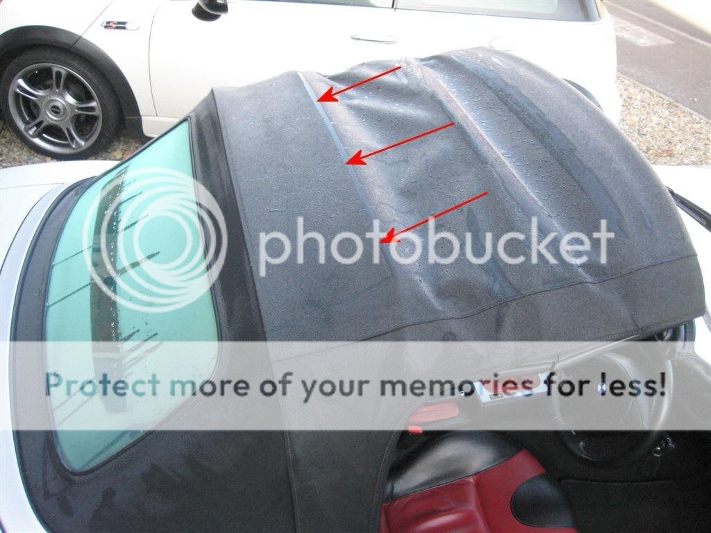 You can clearly see that it is the second roof spar (arrowed) which rubs against the rear screen causing those awful scratches and a fold line.