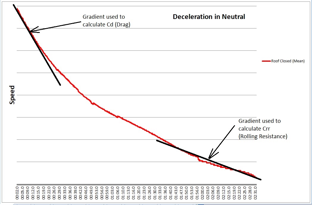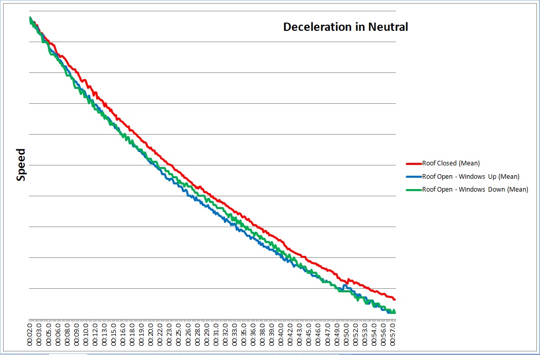As you can see, it decelerates faster with the roof down. This is what you would expect, but it proves there is more drag with the roof down.