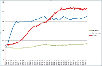 The max intake temp with the fan on was 24 which means the engine brought the temp from 13 to 24. No great surprises there.