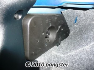 Twist the plastic locking bolt anti-clockwise – once unscrewed you can pull the assembly back (note that the plastic bolt does not come completely away from the unit) – you can lift up the rear carpet to allow you to lengthen the wiring room slightly if required: