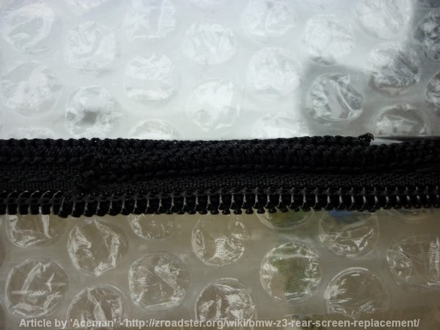 The zip is exactly the same length as the original making it easy to judge where to start zipping the new screen in which is the most difficult part of the job as it is quite fiddly but once on it is just a matter of taking it steady and slowly you don’t get the zip trapped particularly on the corners. I recommend zipping a few inches at a time and inspecting the teeth of the zip to make sure they are all located correctly as it is easy for one not to locate properly enabling you to go back and relocate it. Once zipped up all the way around the zipper just slides off the end and you just then have to secure the ends either with the original clamp if still usable, new clamps supplied with the screen or as I chose to stitch the zip ends shut which I found the easiest albeit laborious as it meant you were in and out passing the needle from inside to out.