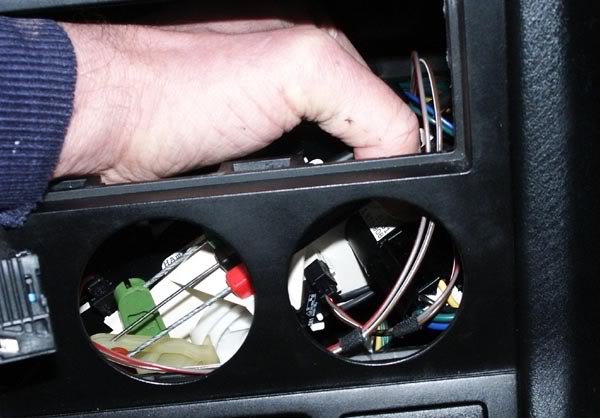 The first step is to extract the radio from the centre console, ideally leaving it connected to the power supply, in order to avoid the necessity of reprogramming the plethora of available options. Users of non-BMW radio units will find this easier, due to the additional length of the adaptor cable used to convert the connector provided by BMW to the standard DIN socket used by other manufacturers.
